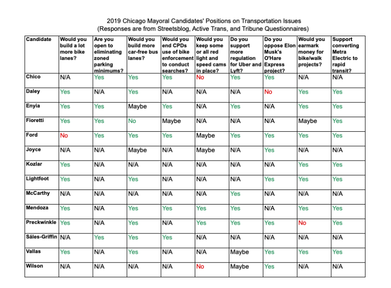 For those of you still agonizing about who to support for Chicago mayor, above is a summary of the candidates’ positions on several transportation issues. View a larger version of the chart here. While we don’t recommend being a single-issue voter, maybe this guide will help tip the scales if you can’t decide between your two favorite mayoral hopefuls.
