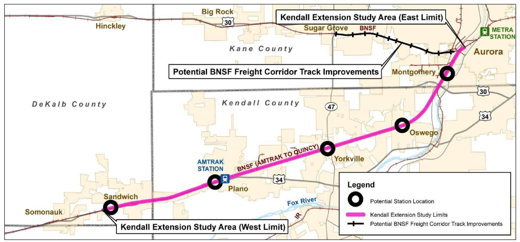 The extension would serve the southwest exurbs of Montgomery, Oswego and Yorkville, and potentially extend further west to the cities of Plano and Sandwich. It would follow the existing BNSF Railway route, which currently terminates in Aurora, but stations and rail yards would have to be built from scratch. While Plano already has Amtrak service, the other municipalities don’t have any kind fixed route connections to the rest of Chicagoland, not even bus service.
