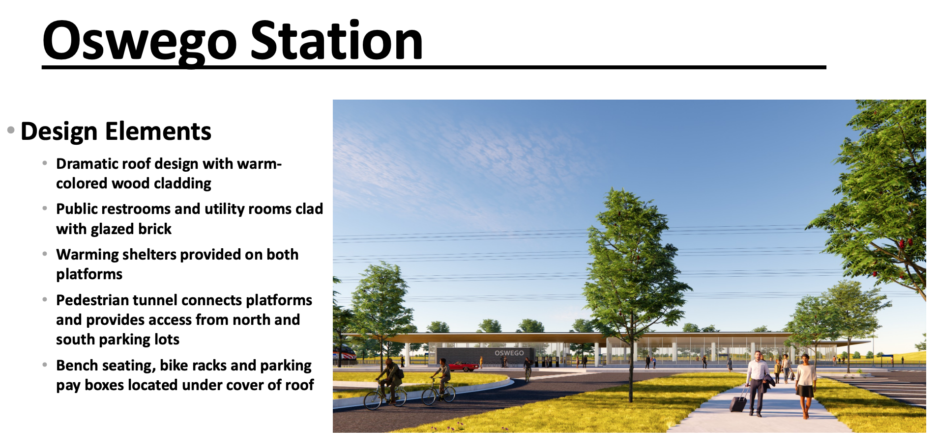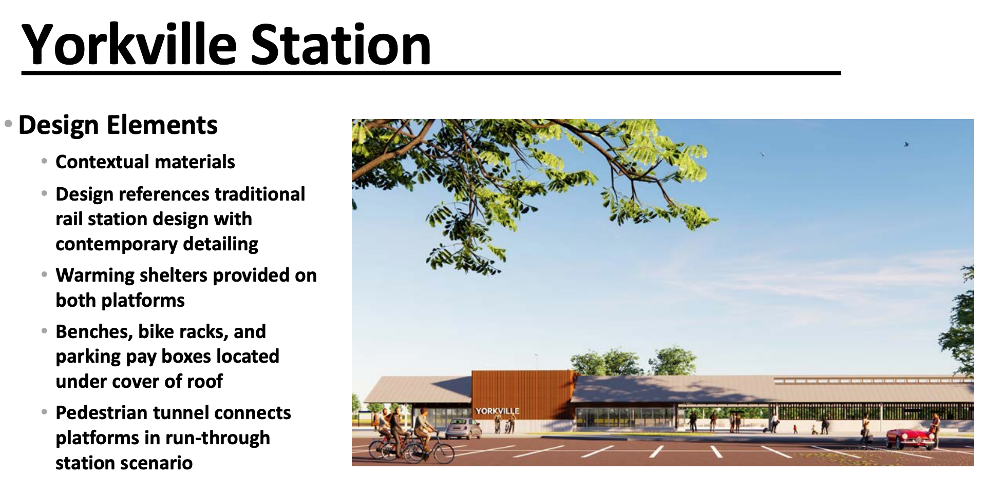 All of the proposed stations have certain common features: two platforms, with a larger station house on the inbound side and a smaller warming shelter on the outbound side; bike racks; at least one large parking lot; and underground pedestrian tunnels to link the two platforms. The Yorkville and Plano station plans come with the caveat that, if one of them would be the terminal, a rail yard to store the trains overnight would need to be built further west.