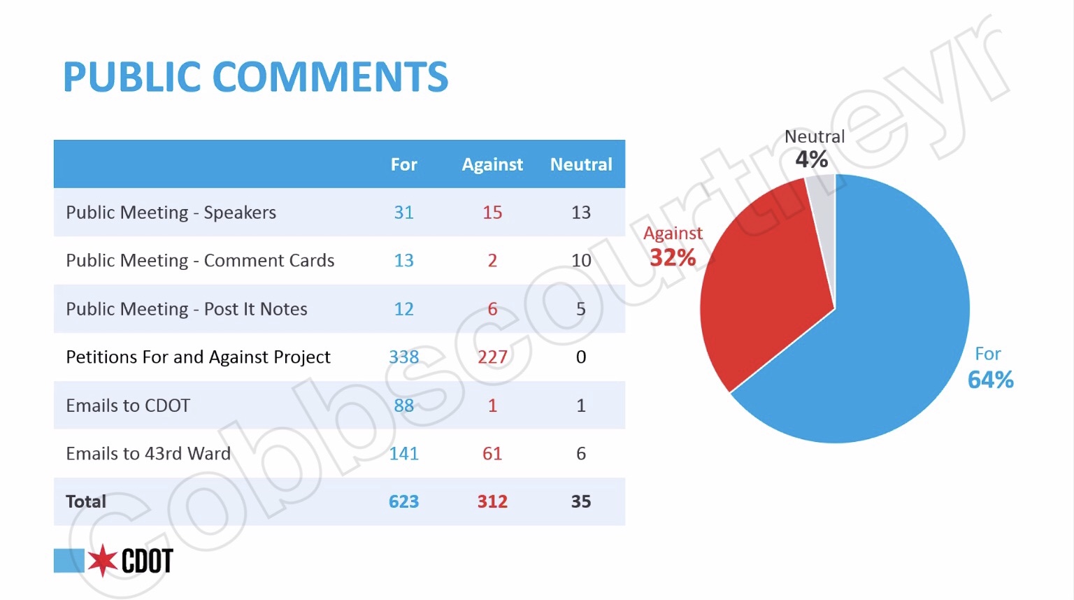 CDOT presented a breakdown of public comments from the August 2019 Dickens Greenway meeting. Sixty-four percent of public comments were in support of the Greenway, 32 percent were against it, and 4 percent were neutral. Key themes emerged from the feedback CDOT received. Those who are supportive of the Greenway cited the need to get around the neighborhood safely, the formalization of an already popular cycling route, and the desire for a safer connection to Oz Park. Comments against the Greenway cited concerns about people from other parts of the city entering the neighborhood, fear of it becoming a “bicycle highway”, and desires to limit the amount of cyclists coming to Oz Park.