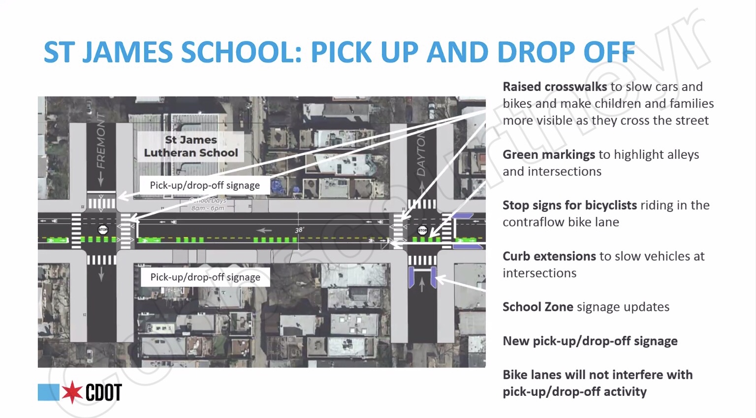 Raised crosswalks, green markings at alleys and intersections, school zone signs and markings, and new pick-up and drop-off signs will be added to the 800 block of West Dickens near St. James. Attendees were advised that the contraflow bike lane will not interfere with pick-up & drop-off activity. Based on feedback from the last public meeting, CDOT is now proposing to widen the contra-flow bike lane to allow for better visibility of cyclists and add dashed bike lane lines at intersections where drivers can make right turns. The dashes will make it clear that turning drivers can cross the bike lane.