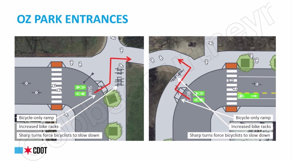 Part of the Dickens Greenway will improve connections to Oz Park. CDOT will be adding a bicycle only ramp to the entrance of Oz Park with a sharp turn in the route that will force cyclists to slow down. See image below.