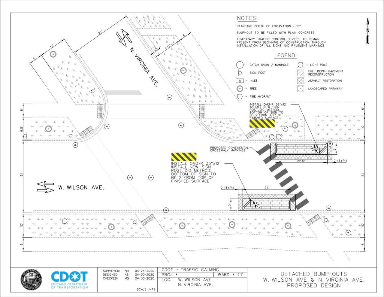 At Wilson and Virginia avenues, just east of the Chicago River, the Chicago Department of Transportation will be installing detached concrete bump-outs to shorten the pedestrian crossing distance on the east leg of the T-shaped intersection, and striping a new crosswalk.