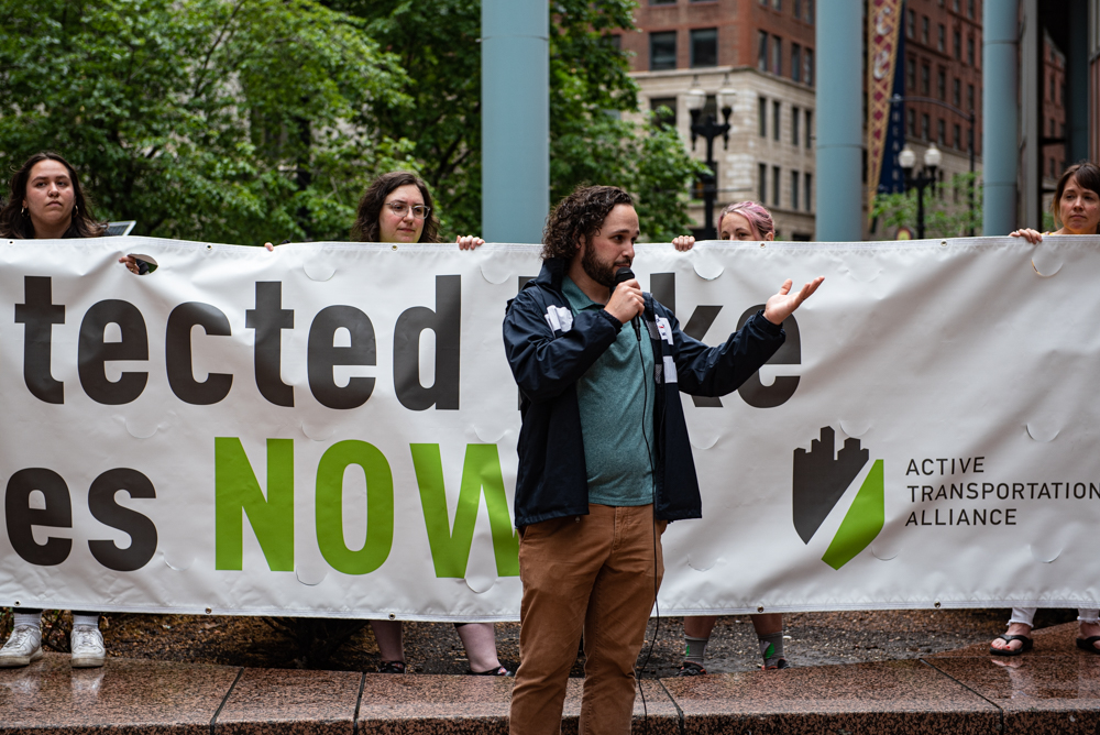 Also speaking was Matt Portman, cousin of “School of Rock” drummer Kevin Clark, 32, who was fatally struck on his bike on May 26 at the complex, dangerous intersection of Logan Boulevard and Western Avenue in Logan Square. He was the second person killed while biking at that location in 13 years, also including the 2008 crash death of Tyler Fabeck, 22. In 2018 ATA and the Logan Square Neighborhood Association released a report calling for safety improvements to the junction, including a road diet, protected lanes, a new crosswalk, and better lighting, but city, county, and state officials took no action.