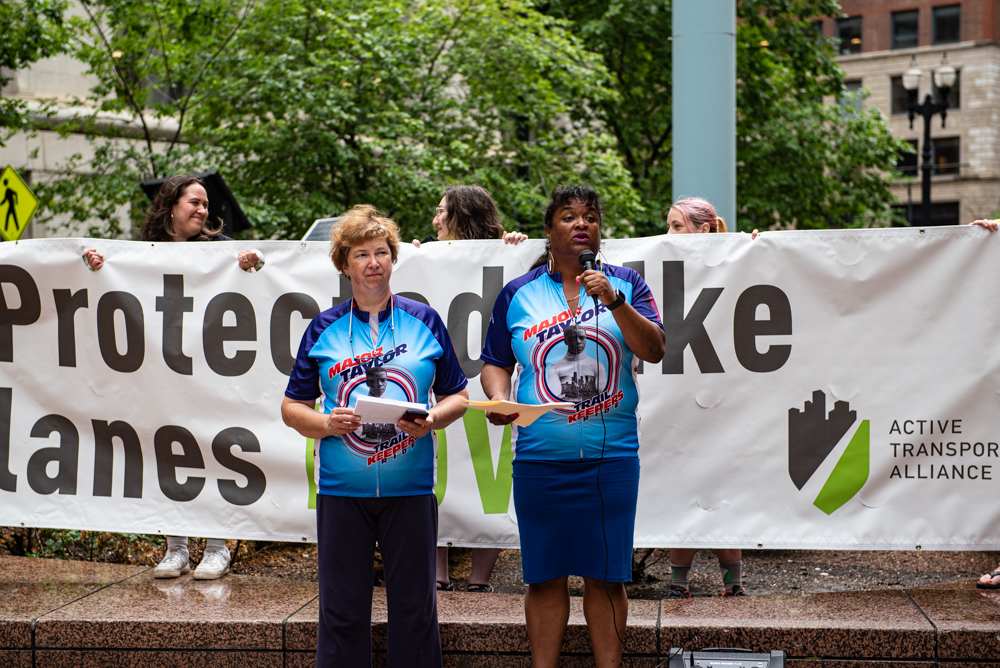Dr. Brenda Dixon, president of Major Taylor Trail Keepers Chicago, and vice president of Friends of the Major Taylor Trail, argued that “Our bicycling infrastructure has not kept up. The money is there. We need to demand that we have protected bike lanes. And we want them now, not ten years from now.”