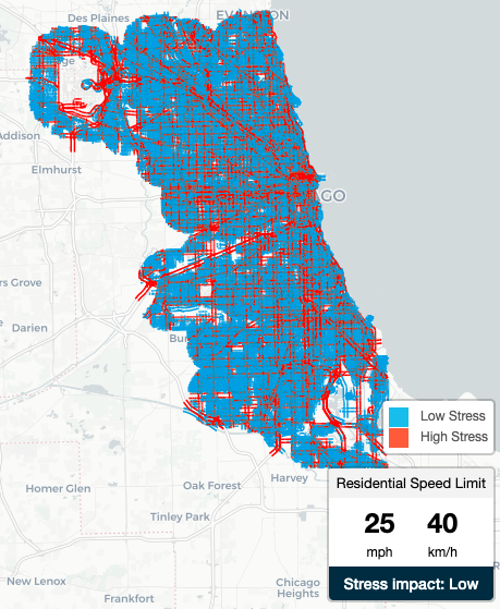 One change that would have sweeping and immediate impact on the PFB scale is Chicago’s default 30 mph residential speed limit. As the Active Transportation Alliance notes in a recent blog post on the PFB score, a person hit by a driver traveling at 20 mph has a 90 percent chance of survival. At 30 mph the survival rate drops to 50 percent. If Chicago were to lower the default speed limit to 25 mph, all residential streets would be reclassified from high-stress to low-stress, painting the PFB heat map blue and goosing Chicago’s bike-friendly street network score from a pitiful 5 to 35.