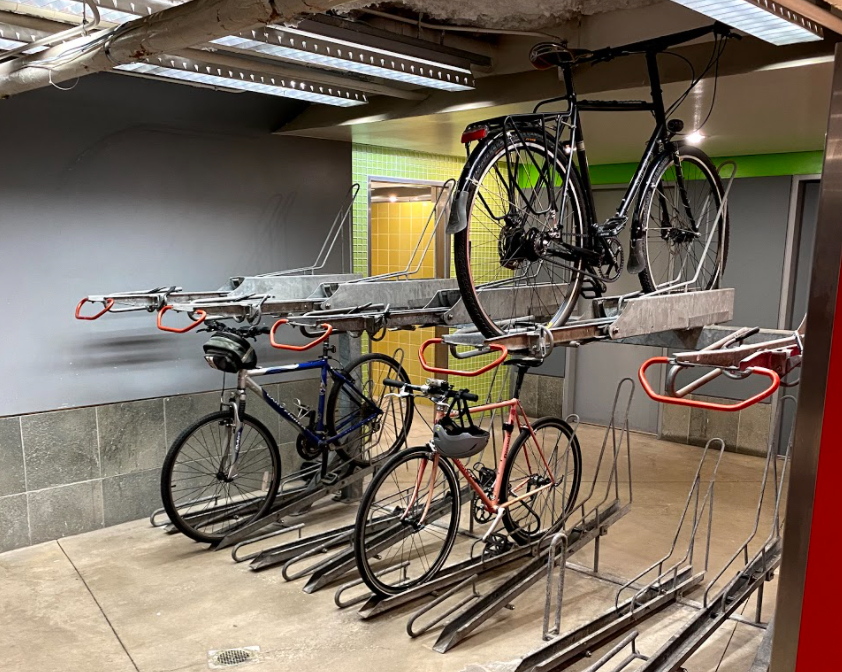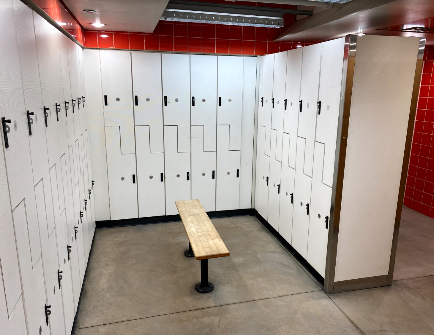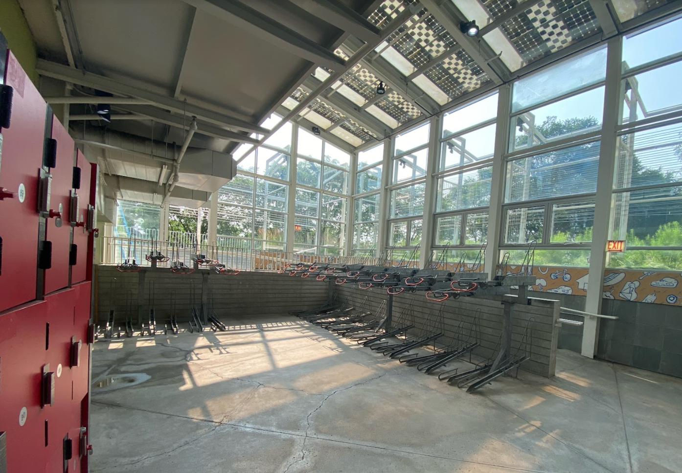 According to Phil LeDonne, the bike station’s general manager, the facility includes 244 indoor bike parking spaces and 100 outdoor spaces, with 92 lockers in the lower level. The men’s shower has 112 lockers, while the women’s locker room has 128 lockers, but the bathroom/shower areas themselves are virtually identical.
