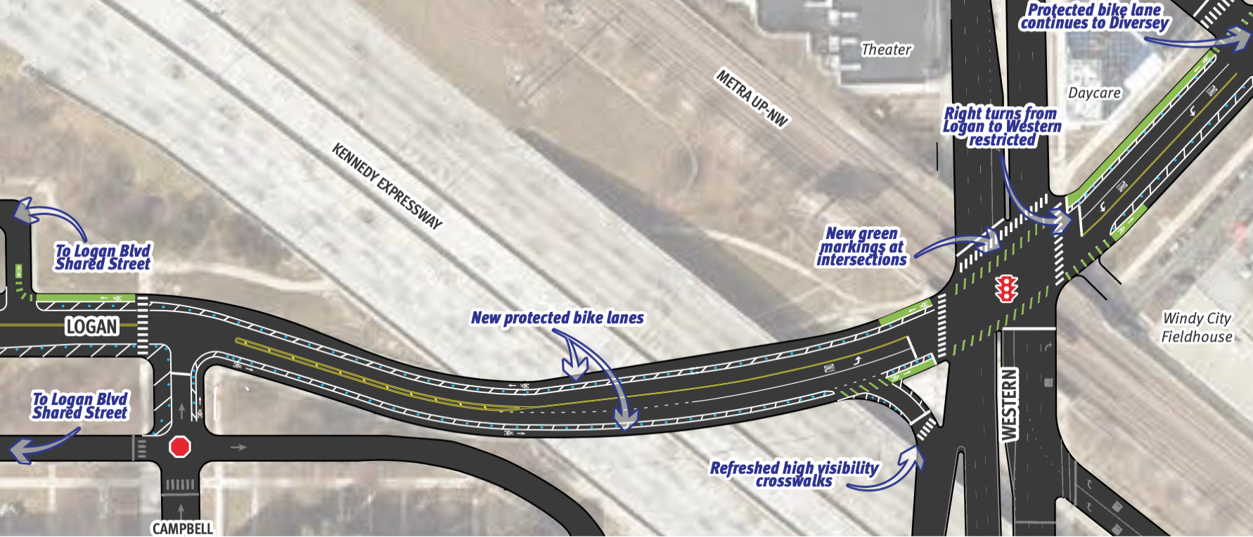 It took the deaths of two different people biking to make it happen, but the dangerous intersection of Logan Boulevard and Western Avenue in Logan Square is finally getting much-needed safety improvements. The Chicago Department of Transportation announced today that a road diet with protected bike lanes is planned for Logan near Western, with construction slated to start in mid-September.