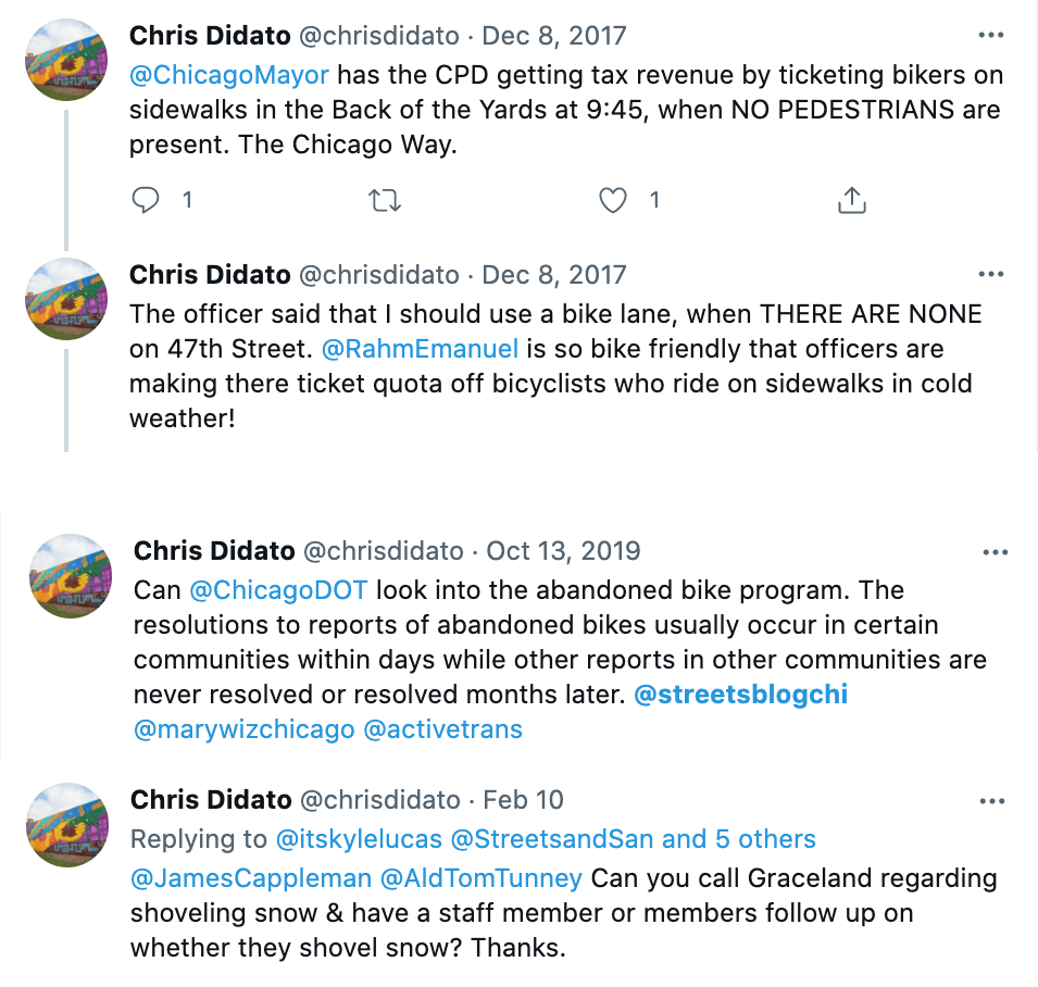 Chris is also active on Twitter, and has weighed in on sustainable transportation topics ranging from zero-tolerance ticketing of cyclists in communities of color; to abandoned bike removal; to the need for better clearance of snow from sidewalks. Here are a few examples of his posts.