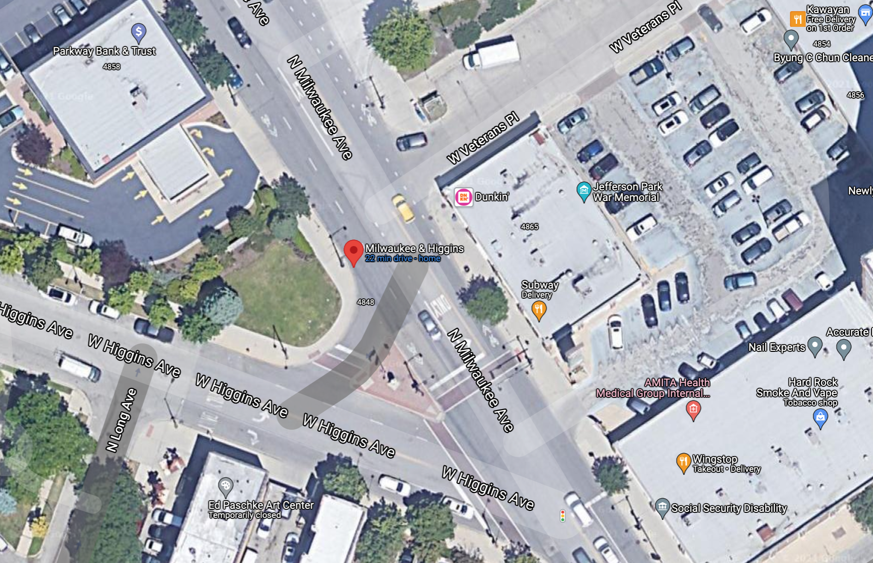 Striping a crosswalk at Veterans Place and Milwaukee would improve pedestrian safety. In addition, the slip lane at the northwest corner of Higgins/Milwaukee should be eliminated by connecting the pedestrian island to the sidewalk to prevent drivers from whipping around the intersection and endangering people walking, something the Chicago Department of Transportation has done at many other locations in town. This idea, plus other improvement to the intersection, as part of a recent Jefferson Park master plan.