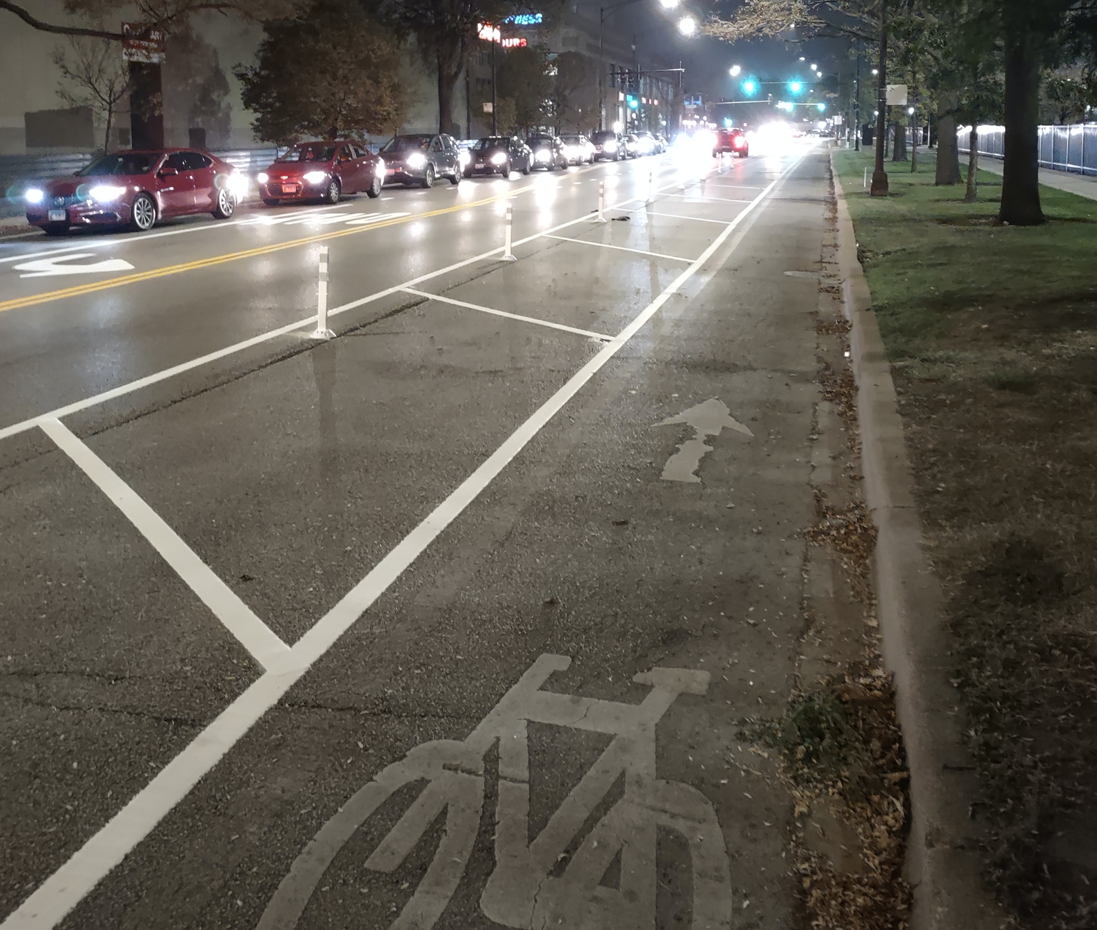 On the bright side, CDOT has striped new paint-and-post lanes on Logan east of Western to Diversey Avenue at the river, by the Diversey Rock and Bowl bowling alley. In some cases the lanes include parking-protection – cyclists will be riding between the curb and parked cars, separated from moving traffic.