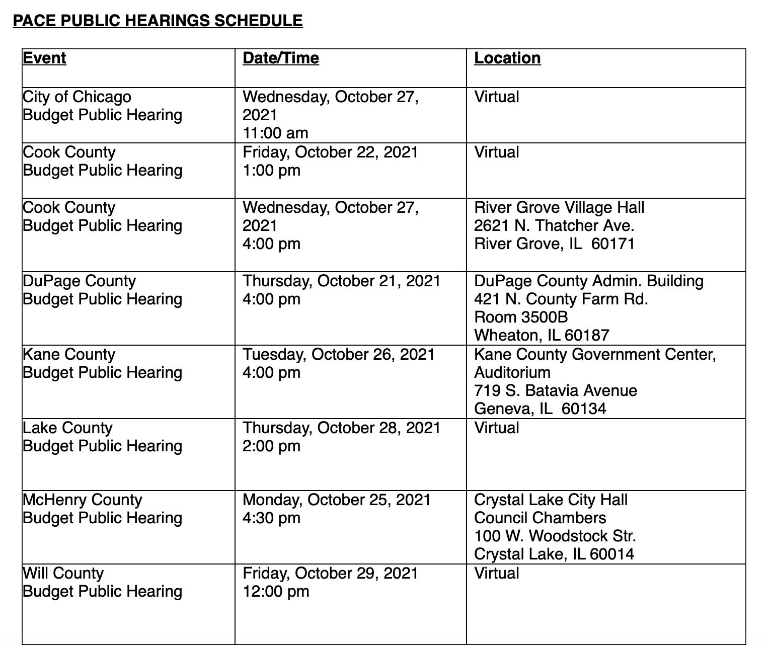If you can’t attend a public hearing, you can comment on the proposed budget through Pace’s website at https://www.pacebus.com/public-hearing-feedback, by email to public.hearings@pacebus.com, by telephone to 847-354-7943, or by mail to: Pace, Community Relations Department, 550 W. Algonquin Rd., Arlington Heights, IL 60005-4412. All comments must be received by 5:00 pm on Friday, October 29, 2021.