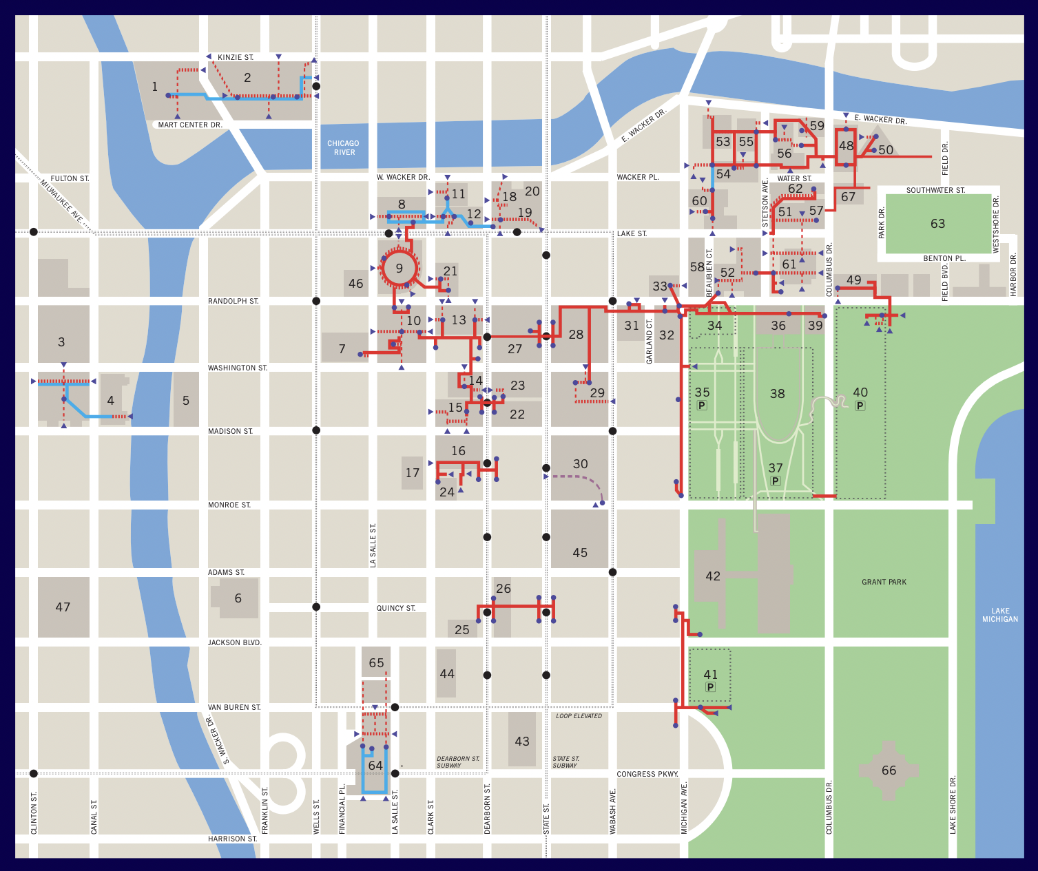 The Chicago Pedway is an overlooked layer of Chicago’s transportation system. It’s downtown’s network of indoor pedestrian pathways, including below-ground tunnels, street-level concourses and overhead skyways, covering about five miles, and connecting more than forty city blocks. It allows pedestrians to traverse the Loop without having to deal with cold, heat, rain, snow or the Loop’s hectic, often dangerous, street traffic.