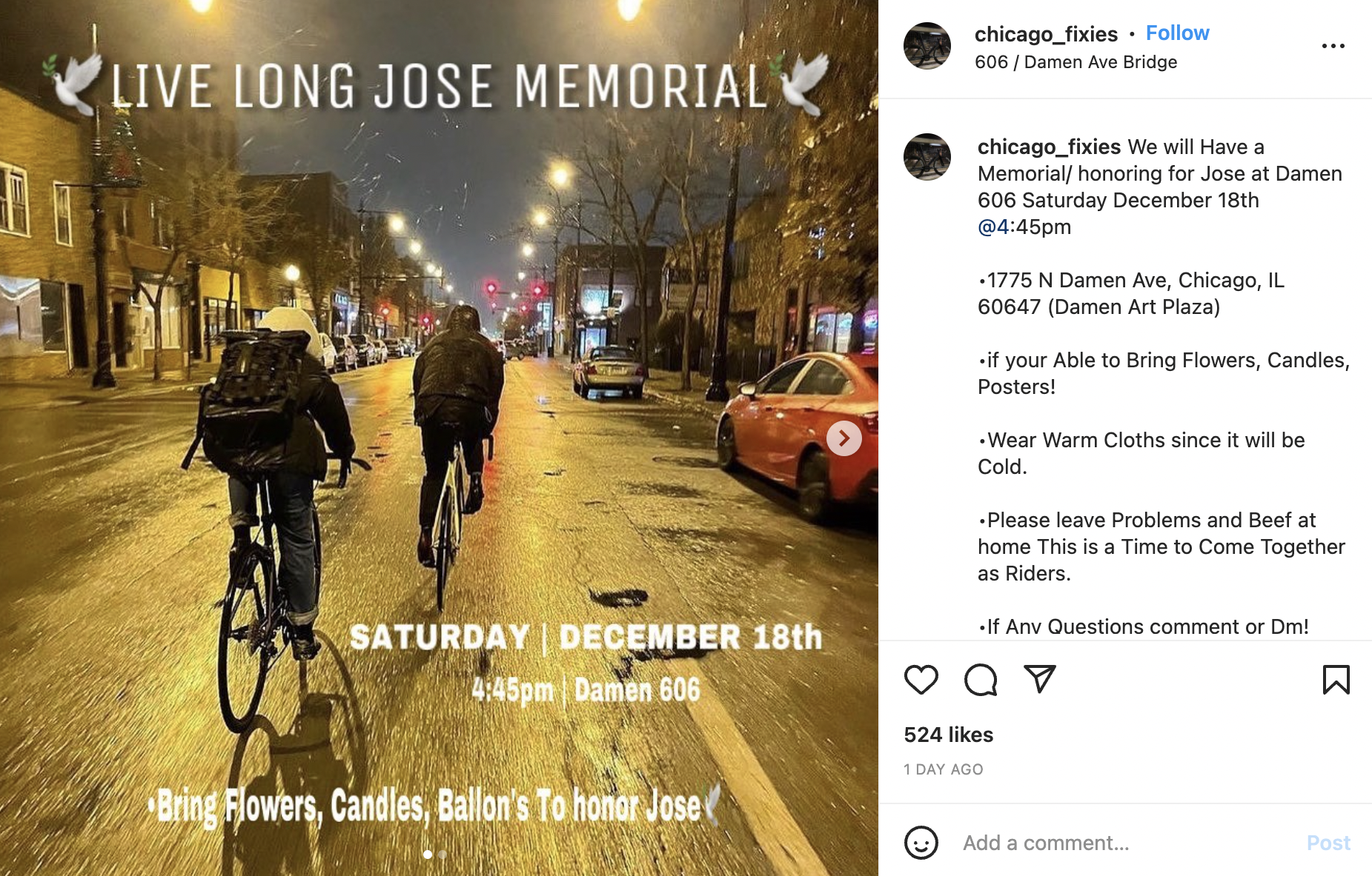 Bike Lane Uprising, an organization that documents bike lane obstructions, noted on Twitter that the local fixed-gear Instagram account Chicago Fixies is planning a memorial for Velásquez on Saturday, December 18, at 4:45 p.m. at the Damen Avenue plaza of The 606 elevated greenway, 1775 North Damen. The plaza is a popular gathering spot for young fixed-gear riders. Attendees are asked to bring flowers, candles, and balloons. BLU arranged for a white-painted “ghost bike” memorial to be created. “It truly hurts to know you’re gone,” reads a post from Chicago Fixies. “It hurts to know you passed while doing something you loved.”