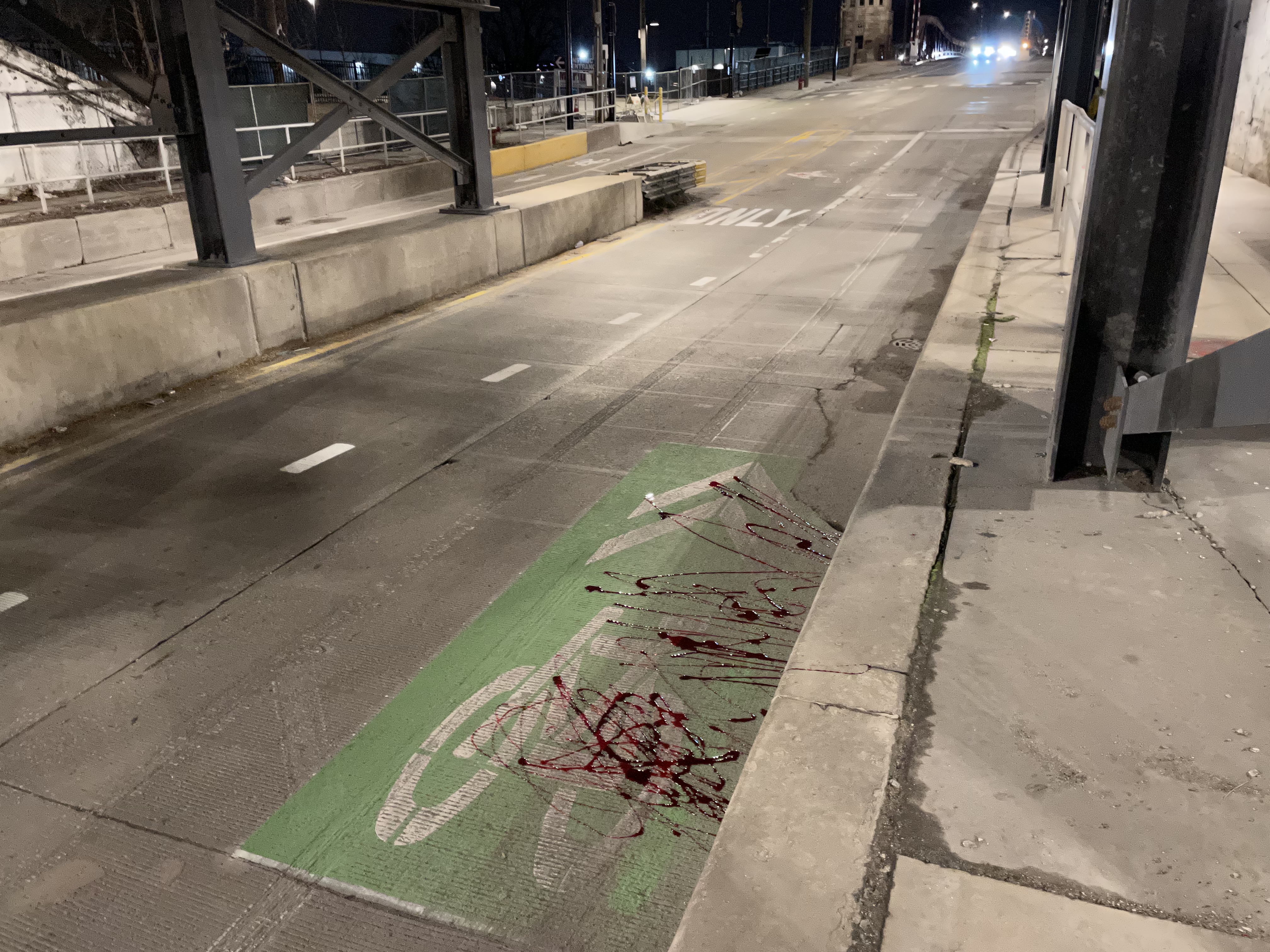 As the rally drew to a close, sustainable transportation advocate Kyle Lucas (also a co-founder of Better Streets Chicago) announced that the group had brought some fake blood made of corn syrup, and asked for help pouring it on the street.