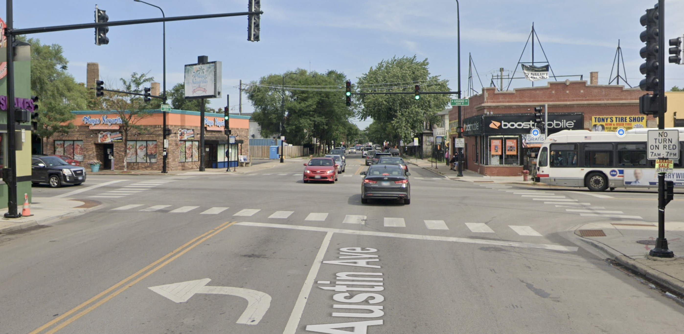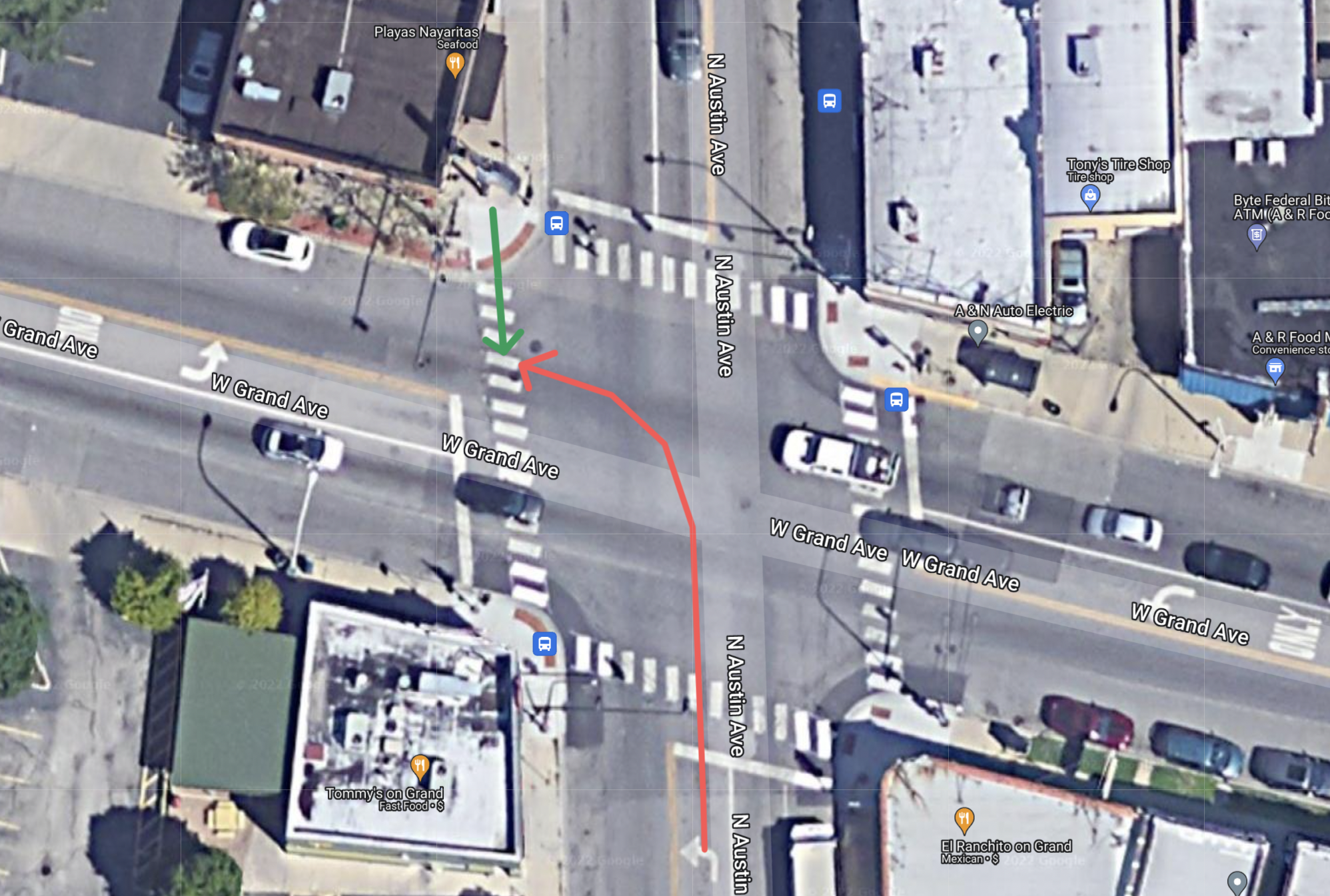 On Thursday, March 17, at about 8:00 p.m., Grande was walking south across the 6000 block of West Grand in a crosswalk, according to Police News Affairs. Grand is a northwest-southeast diagonal street at this location, so the intersection is skewed.