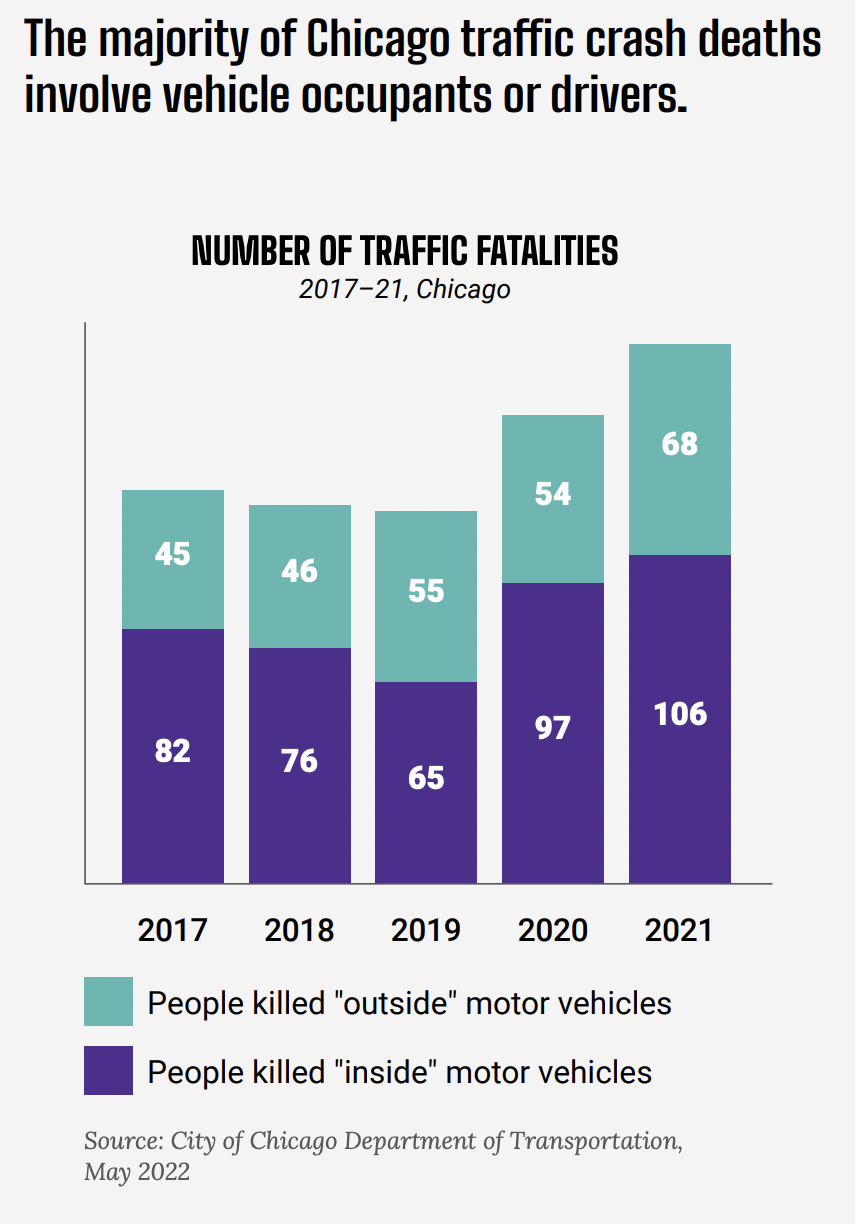 However, I found it odd that on the supporting data page the headline of a traffic fatalities chart stated, “The majority of Chicago traffic crash deaths involve vehicle occupants or drivers.” Traffic deaths are always tragic, but during the COVID-19 pandemic the number of people killed outside motor vehicles (i.e. on foot, bike, etc.) has increased at a higher rate than the number of motorist deaths.