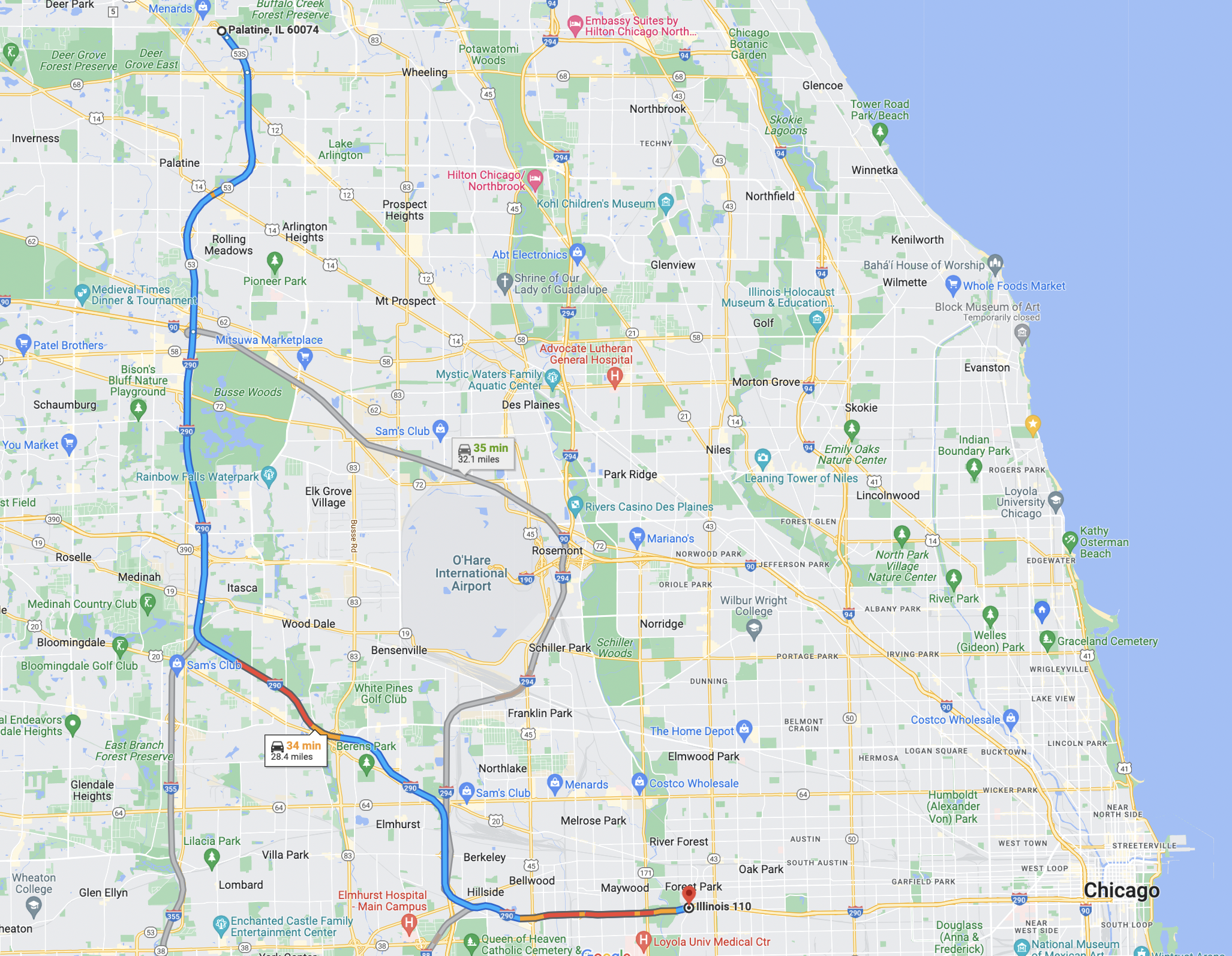 Pace Route 757, a commuter express service that ran between Oak Park, Forest Park and the northwest suburbs, used I-290 between Forest Park and Bensenville, but the route has been suspended since spring 2020. Route 604 currently uses IL 53 to travel between the Northwest Transportation Center and the Rand Road corridor in Palatine.